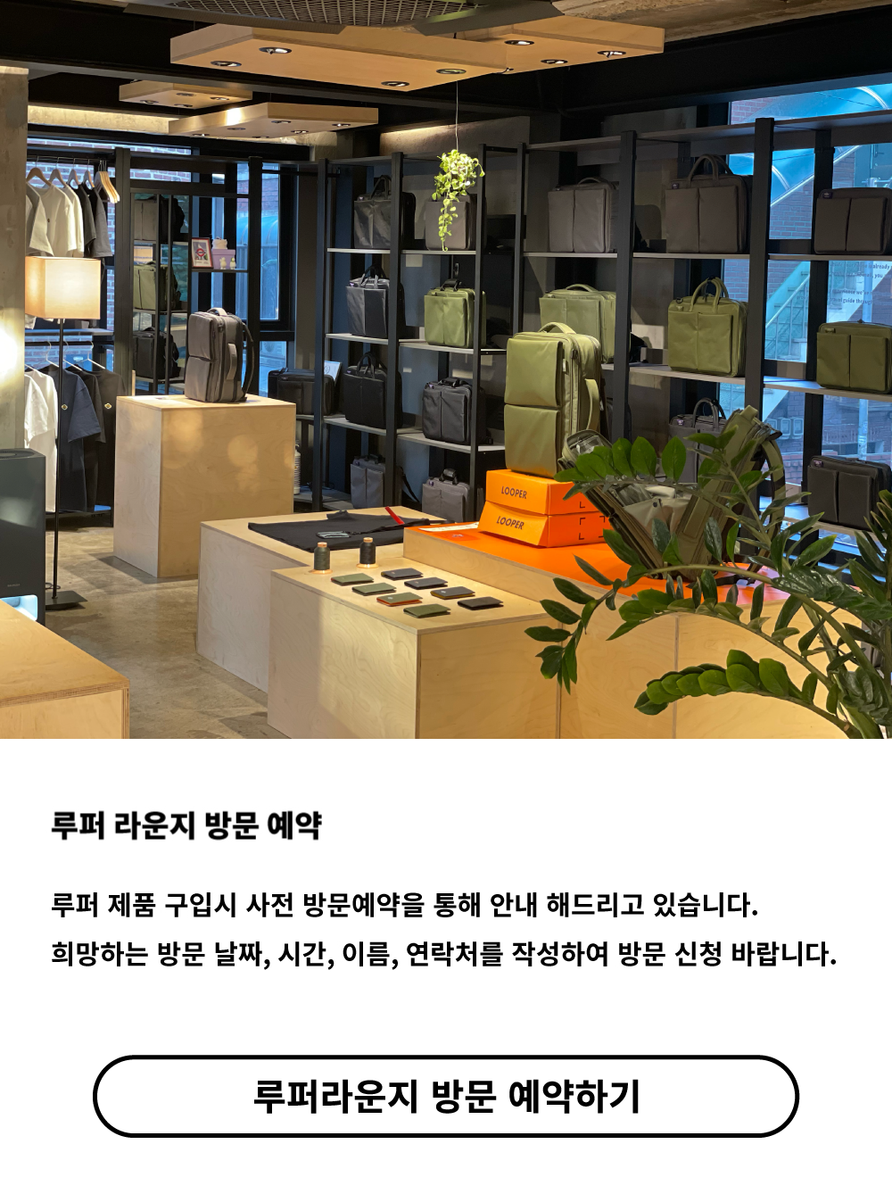 루퍼 제품 구입시 사전 방문예약을 통해 안내 해드리고 있습니다.희망하는 방문 날짜, 시간, 이름, 연락처를 작성하여 방문 신청 바랍니다.